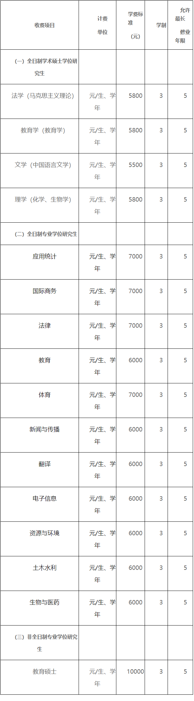 根據《教育部國家發展改革委財政部關于深化研究生教育改革的意見》(教研〔2013〕1號)、《財政部國家發展改革委教育部關于完善研究生教育投入機制的意見》(財教〔2013〕19號),以及教育部和相關專業碩士研究生教學指導委員會文件精神,經上級財政核定,我校各類型碩士研究生學費標準及學制如下: